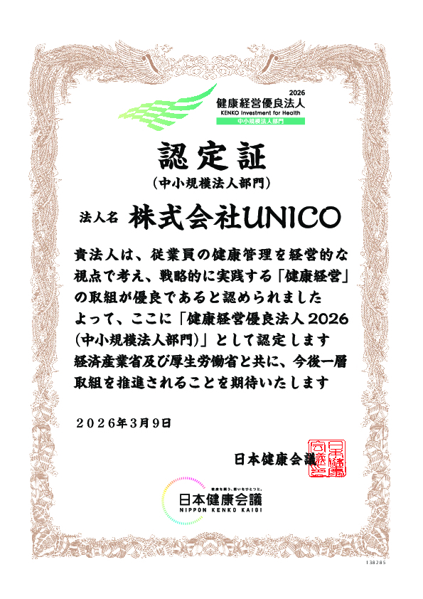 HOME ニュース 健康経営優良法人20... ニュース 2026/03/10 ニュース 健康経営優良法人2026 認定取得 平素は格別のご高配を賜り誠にありがとうございます。 この度、「健康経営優良法人2026」 の認定をいただきました。 これからも、 社員一人ひとりが安心して働ける環境づくりを続けながら、 よりよい会社づくりに取り組んでいきます。 ACTION!健康経営|ポータルサイト(健康経営優良法人認定制度) NEXT > < LIST >